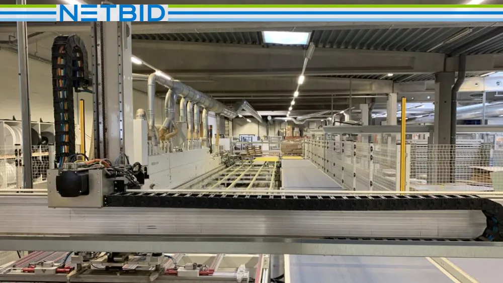 Machine de plaquage de chants unilatérale SCM Stefani One Cell pour panneaux de 250 à 3000 mm, avance longitudinale. Disponible immédiatement à 2300 Turnhout, Belgique. Vendue exclusivement via www.netbid.com