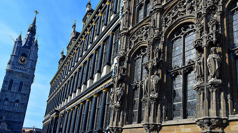 Sinds eind oktober staat het Gentse stadhuis aan de kant van de Hoogpoort en een deel van de Botermarkt in de steigers. Aan die zijde worden de dakstructuur en -bedekking van het stadhuis namelijk volledig gerenoveerd. De werken moeten eind 2020 klaar zijn.